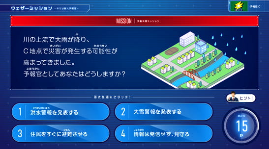 9面の大型マルチモニターとその前に並んだ3台の参加者用のタッチパネルモニターで構成されたチャレンジクイズのコーナーです。参加者は気象予報士の研修生というシュミレーション形式となっており、マルチモニターから出題される天気に関するクイズをいくつか経験し、最後に突如やってくる天災にみんなで対応します。参加者のタッチ操作が心地よくマルチモニターに反映するネットワークシステムです。
